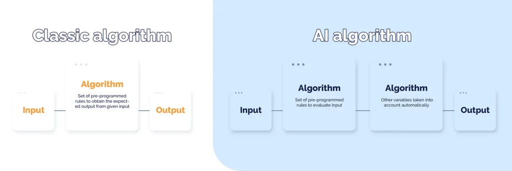 In comparison to regular algorithms, AI algorithms are based on machine learning, meaning that they don’t rely only on pre-programmed processes but can take more variables into account and create solutions on their own.