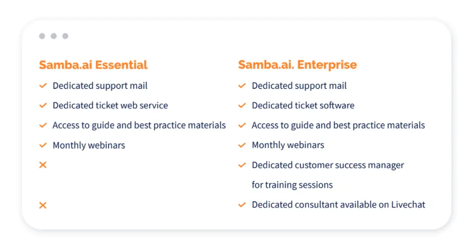 You’ll still be able to use Samba.ai just like you used to before the changes occured. The only differences are placed in improved functionalities and some of the Terms of Services conditions changed according to the new pricing model. We have conducted deep analytical research on how you are using Samba’s apps and how much you need the assistance of our support consultants. The results have led us to change the way our communication channels will operate for each version of Samba.ai.