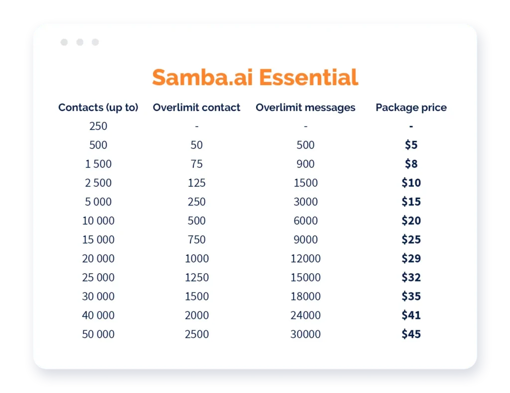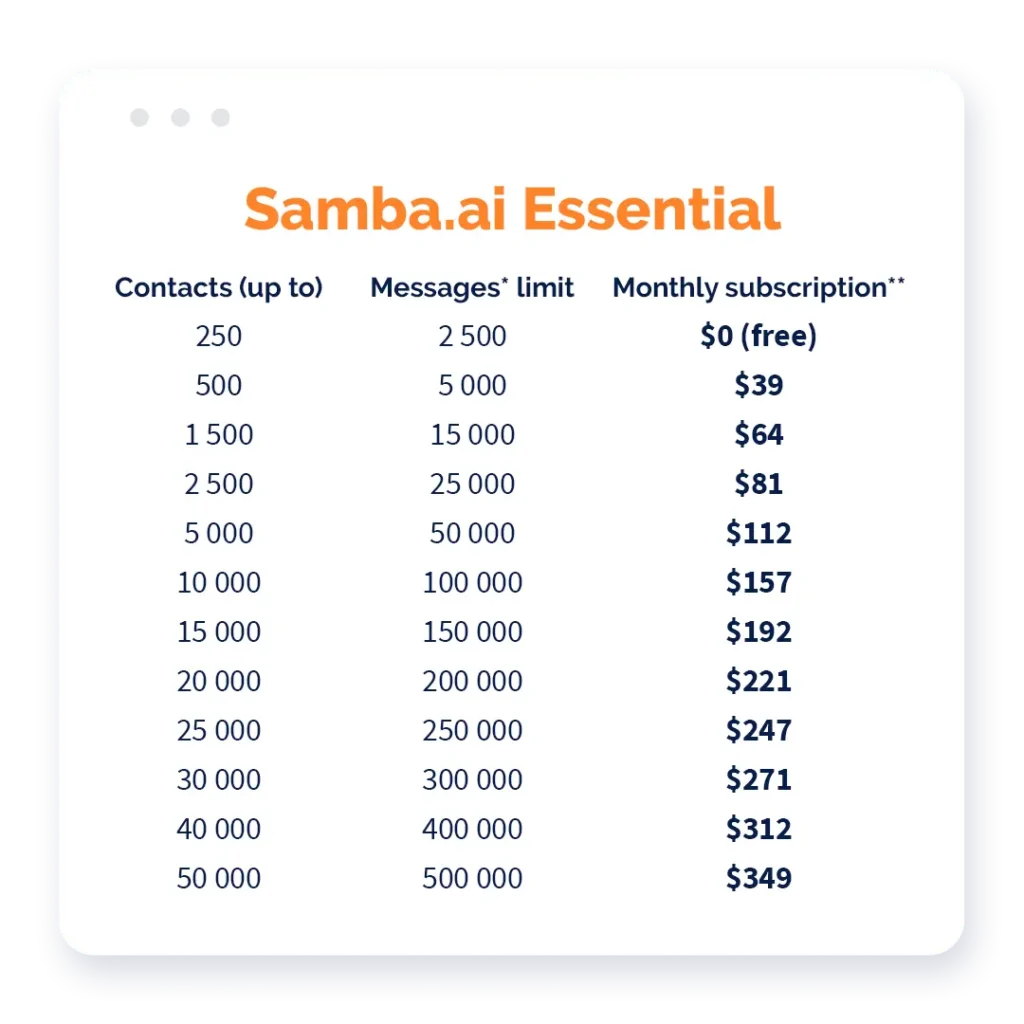 From September 1st 2021, you’ll be allowed to use improved Samba.ai functionalities based on even more clear conditions. The new pricing is based on monthly subscriptions with limitations for the number of contacts and e-mail or push messages (it’s 10 messages per contact!).